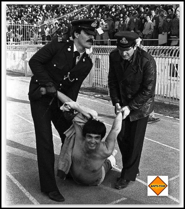 Ο Μητσάρας στο γήπεδο Καραϊσκάκη, το 1982, στον αγώνα Εθνικός-ΠΑΟ,τη στιγμή που τον συλλαμβάνουν! Πάντα με χαμόγελο!