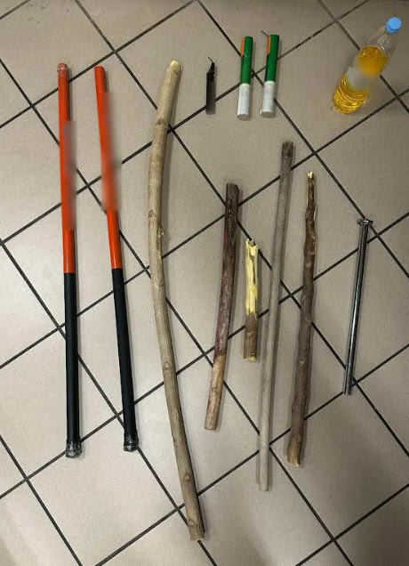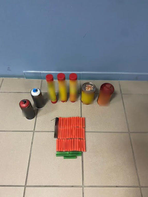 Στο πλαίσιο των ερευνών, βρέθηκαν σε χώρους των λεσχών αλλά και στο παραπάνω γραφείο και κατασχέθηκαν 4 καπνογόνα, 46 κροτίδες, 3 ναυτικές φωτοβολίδες, 2 σπρέι μπογιάς, 5 ξύλινα κοντάρια, μεταλλική ράβδος, 2 πτυσσόμενα μεταλλικά κοντάρια και μπουκάλι με βενζίνη.