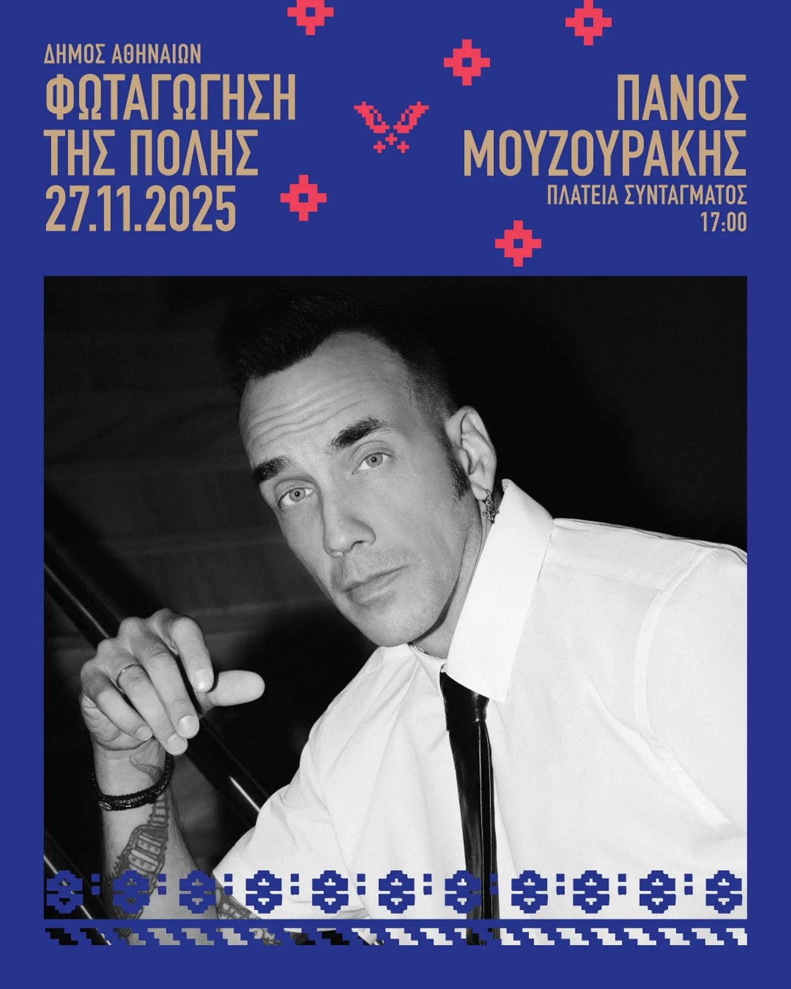 Ο Πάνος Μουζουράκης θα παρουσιάσει από τις 18.30 έως τις 20.30, ένα εντυπωσιακό χριστουγεννιάτικο live show, ειδικά διαμορφωμένο για τη γιορτινή βραδιά. Με αγαπημένες επιτυχίες, όπως «Μεγαλώνω», «Έπαθα Αγάπη», «Αυτή Είναι Η Ζωή», «Φίλα Με Ακόμα», «Μαντάμ», καθώς και με ιδιαίτερες διασκευές, ο ανατρεπτικός ερμηνευτής και performer υπόσχεται μια συναυλία γεμάτη συναίσθημα, κέφι και χριστουγεννιάτικη διάθεση.