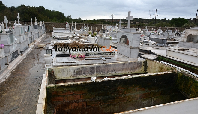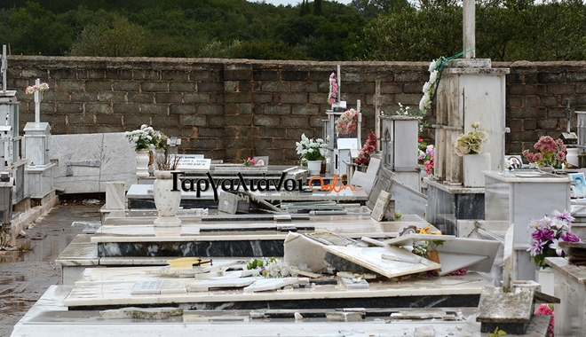 Οι ισχυροί άνεμοι και η καταιγίδα που έπληξαν το πρωί τους Γαργαλιάνους 'χτύπησαν' και το νεκροταφείο της περιοχής προκαλώντας πολύ σοβαρές καταστροφές