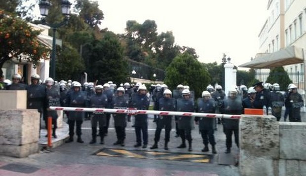 15:37 Εντός του περιβόλου της Βουλής ισχυρές δυνάμεις των ΜΑΤ.