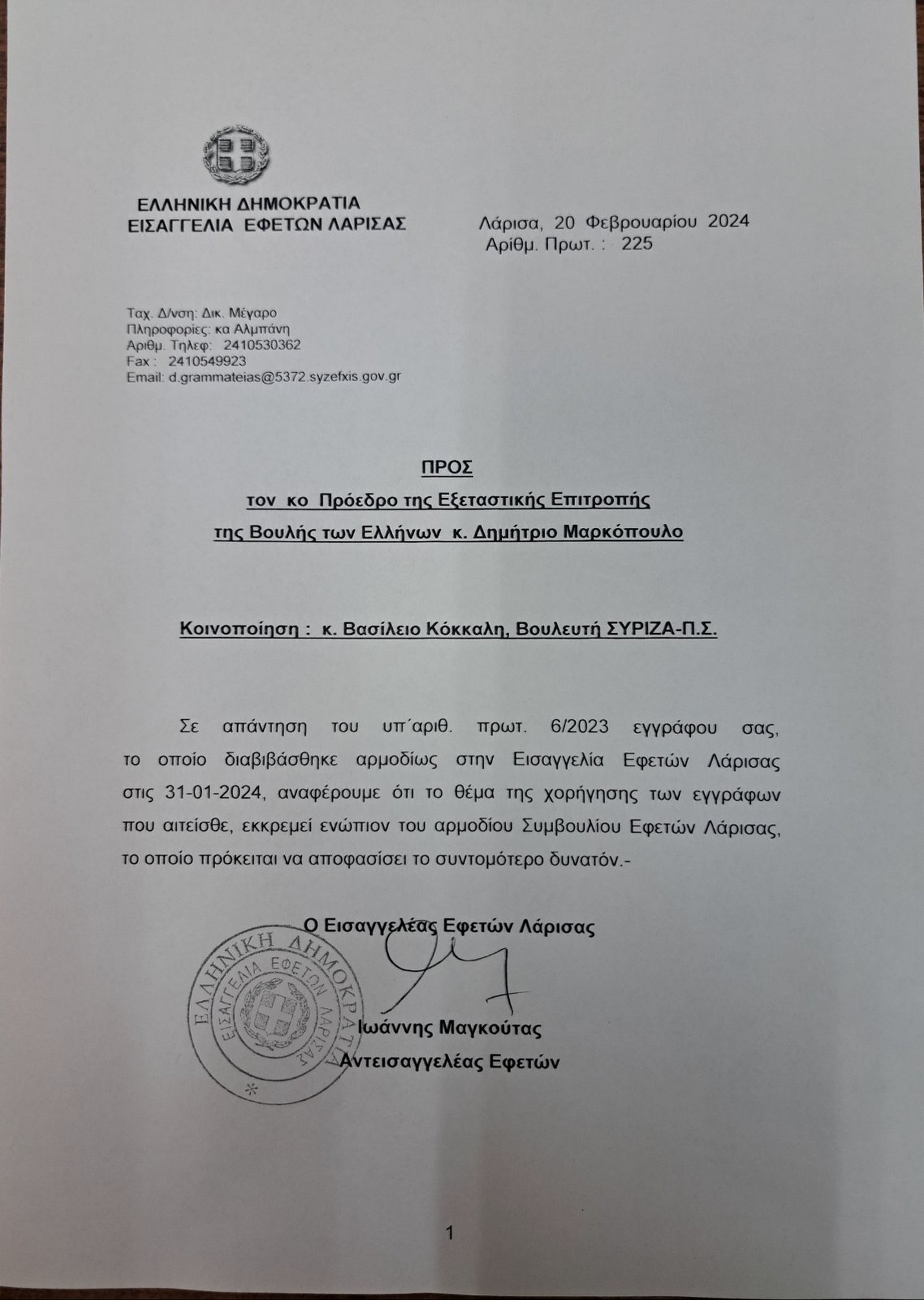 H Εισαγγελία Εφετών Λάρισας απέστειλε απάντηση στη σημερινή συνεδρίαση της Εξεταστικής Επιτροπής για τα Τέμπη. Είχε προηγηθεί ερώτημα του εισηγητή του ΣΥΡΙΖΑ, Β. Κόκκαλη.