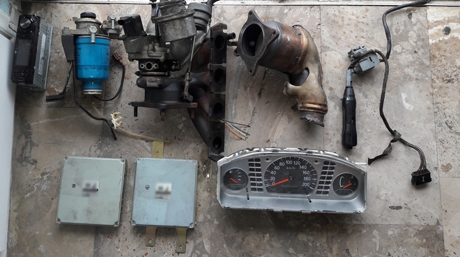 Στο Αίγιο, στην οικία 33χρονου μέλους της οργάνωσης, που αναζητείται, ένα αυτοκίνητο ως μέσο τέλεσης των αξιόποινων πράξεων, δυο ηλεκτρονικοί εγκέφαλοι αυτοκινήτων, μια τουρμπίνα αυτοκινήτου και ένα μοχλός οργάνου αυτοκινήτου.