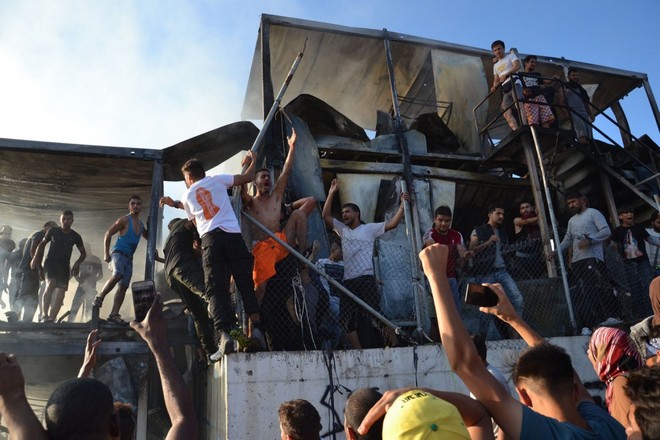 «Το απόγευμα της Κυριακής ξέσπασαν δύο φωτιές, η μία εκτός του hotspot η οποία σβήστηκε σε λίγα λεπτά και η άλλη λίγο μετά εντός του hotspot από άγνωστη μέχρι στιγμής αιτία, σίγουρα όμως όχι από επεισόδια. Η φωτιά ξεκίνησε κοντά ή μέσα σε ένα κοντέινερ. Επεκτάθηκε γρήγορα και έκαψε ολοσχερώς 8 κοντέινερ και 12 στο σύνολο. Επιβεβαιωμένοι νεκροί είναι 2, μία μητέρα και ένα παιδί, αλλά είναι πολύ πιθανόν να είναι παραπάνω. Οι πρόσφυγες προσέτρεξαν να σβήσουν τη φωτιά και η αστυνομία επιτέθηκε με δακρυγόνα για να τους διώξει, την ώρα που έμπαινε ένα πυροσβεστικό. Αυτό εξόργισε τον κόσμο, ο οποίος επιτέθηκε στο πυροσβεστικό. Έγιναν επεισόδια σε διάφορα σημεία του ΚΥΤ με την αστυνομία, τα οποία συνεχίζονται σποραδικά μέχρι τώρα στους ελαιώνες (όπου υπάρχουν σκηνές). Ο κόσμος εκκένωσε τον χώρο και πολλοί νοσηλεύονται στο ιατρείο των Ιατρών Χωρίς Σύνορα που βρίσκεται ακριβώς απέξω. Επίσης πολλά άτομα έχουν τραυματιστεί και έχουν μεταφερθεί στο νοσοκομείο.