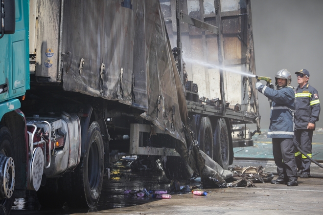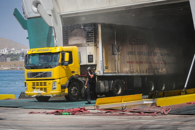 Οι εικόνα των καμένων φορτηγών μαρτυρά την έκταση της ζημιάς στο εσωτερικό του πλοίου αφού οχήματα και εμπορεύματα έχουν υποστεί ολοκληρωτική καταστροφή, τόσο από τη ίδια τη φωτιά όσο και από τις υψηλές θερμοκρασίες που αναπτύχθηκαν.