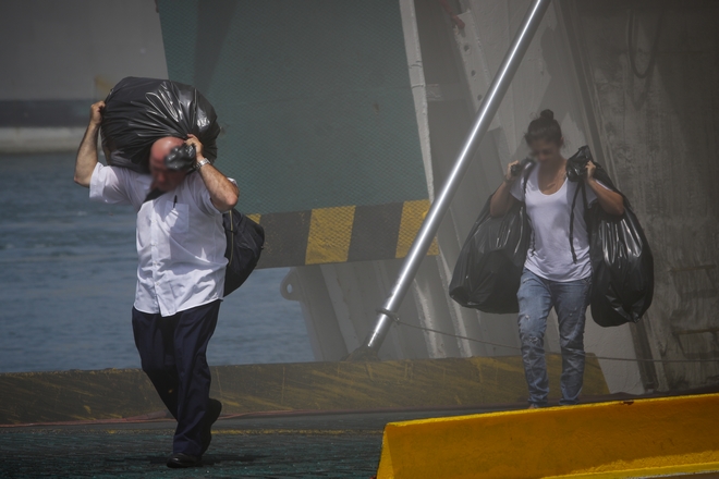 Μάχη με τις φλόγες για δεύτερη συνεχή μέρα δίνουν οι πυροσβεστικές δυνάμεις στο πλοίο "Ελευθέριος Βενιζέλος" προκειμένου να σβήσουν τη φωτιά - Έχουν καταφέρει να μπουν σε όλους τους χώρους του πλοίου βγάζοντας τα καμένα φορτηγά από το εσωτερικό του.
