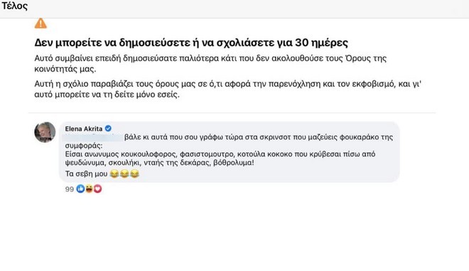 Έληξε ο ψηφιακός αποκλεισμός που υπέστη η Έλενα Ακρίτα από το Facebook. “Όταν σε βρίζει ενας φασίστας, στο Facebook είναι απλώς Τριτούλα. Όταν απαντάς στον φασίστα, σε φιμώνουν για 30 μέρες” είχε σχολιάσει χαρακτηριστικά η ίδια σε κείμενό της. “Όταν ρατσιστές, ομοφοβικοί και φασίστες με έβριζαν με τους πιο αγοραίους χαρακτηρισμούς, στο Facebook ήταν απλά Τριτούλα” έγραφε χαρακτηριστικά.