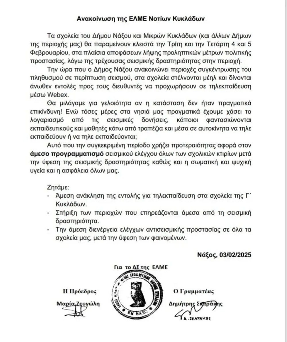 Η ΕΛΜΕ Νοτίων Κυκλάδων εξέδωσε την Δευτέρα ανακοίνωση με την οποία ζητά -μεταξύ άλλων-τον άμεσο έλεγχο αντισεισμικής προστασίας των κτιριακών εγκαταστάσεων των σχολείων μετά την ύφεση των φαινομένων και την άμεση ανάκληση της τηλεκπαίδευσης στα σχολεία της Γ’ Κυκλάδων.
