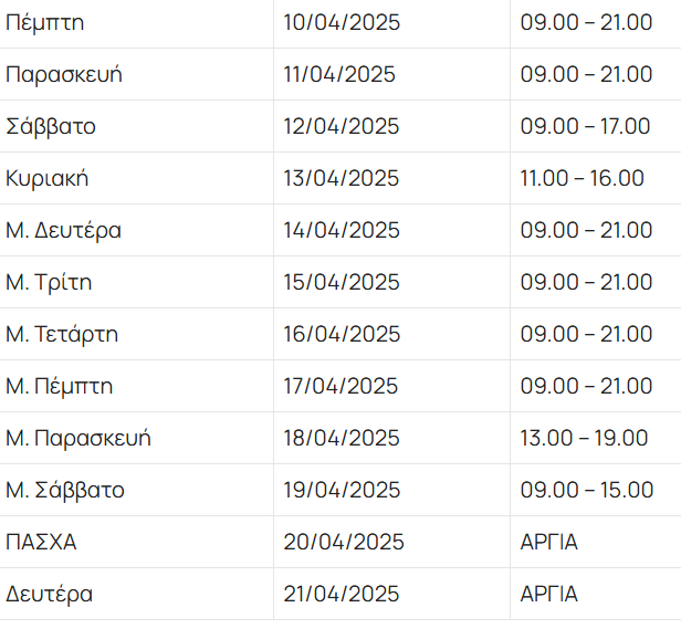 Με ανακοίνωσή του ο Εμπορικός Σύλλογος Αθηνών έκανε γνωστό ότι προτείνει το κάτωθι ωράριο λειτουργίας των εμπορικών καταστημάτων για την εορταστική περίοδο του Πάσχα 2025.