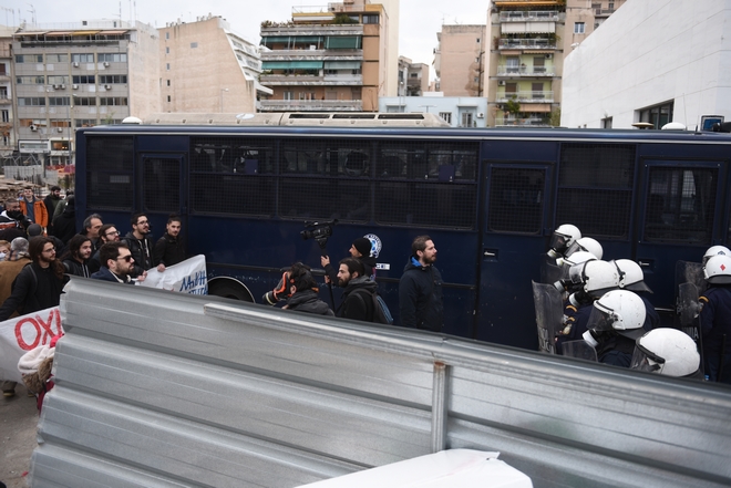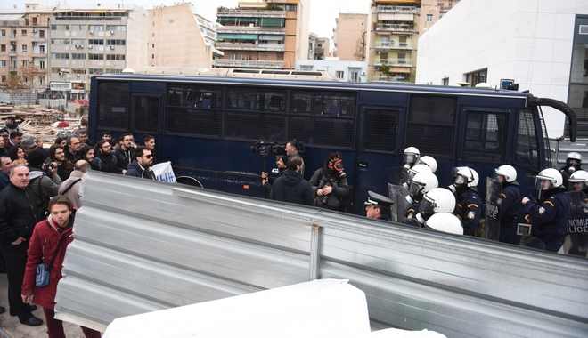 Τα μέλη των κινημάτων και των συλλογικοτήτων έσπασαν τις λαμαρίνες του εργοταξίου σε μια προσπάθεια να αποφύγουν τον φραγμό και να εισέλθουν στο κτίριο. Οι αστυνομικοί απώθησαν τους διαδηλωτές οι οποίοι πέταξαν αντικείμενα εναντίον τους και τα ΜΑΤ αντέδρασαν με περιορισμένη χρήση χημικών. Δεν σημειώθηκαν τραυματισμοί, προσαγωγές ή συλλήψεις.