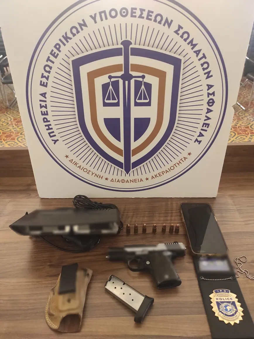 Από την έρευνα που πραγματοποιήθηκε στον ίδιο καθώς και σε όχημα, ιδιοκτησίας του, βρέθηκαν και κατασχέθηκαν πιστόλι, σε δερμάτινη εσωτερική θήκη, με γεμιστήρα που περιείχε 7 φυσίγγια, ειδική συσκευή προβολής φωτεινών σημάτων προειδοποίησης (φάρος), δερμάτινη αναδιπλούμενη θήκη με την ένδειξη εξωτερικά «INTERNATIONAL POLICE ORGANIZATION», χρυσό σήμα και κάρτα με την ίδια ένδειξη και το ονοματεπώνυμο του κατηγορούμενου, υπεύθυνη δήλωση, άνευ γνησίου υπογραφής και κινητό τηλέφωνο.
