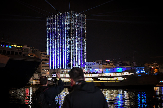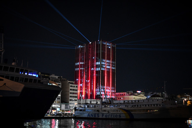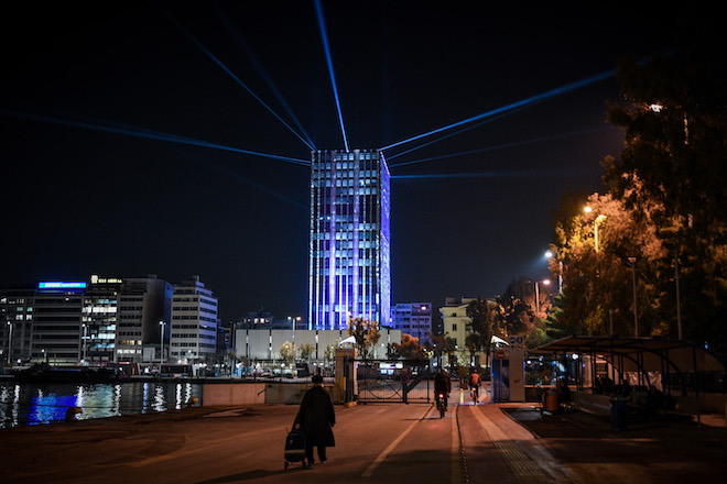 Εντυπωσιακές εικόνες: Φωταγωγήθηκε ο Πύργος του Πειραιά
