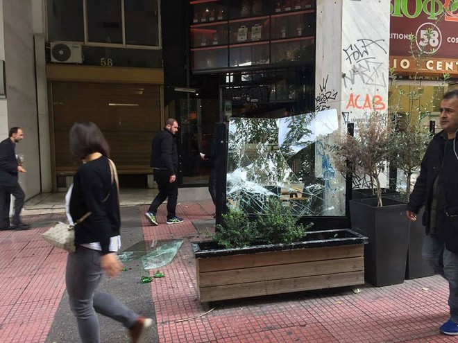 Ενώ η πορεία έφτανε στη Ομόνοια, ομάδα 150 περίπου νεαρών που βρίσκεται κοντά στο κύριο μέρος της διαδήλωσης φορώντας κουκούλες, έσπασε καφετέρια και ένα ATM.
