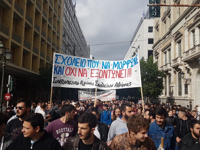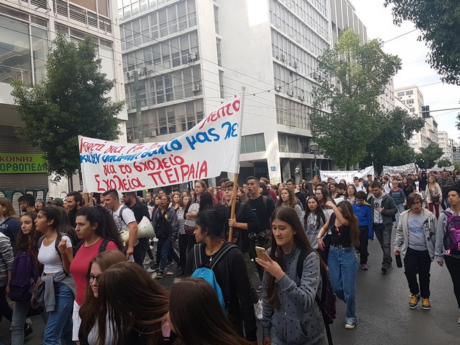 Σε πορεία διαμαρτυρίας έπειτα από κάλεσμα της ΕΛΜΕ μαθητές και καθηγητές στο κέντρο της Αθήνας το μεσημέρι της Δευτέρας. Στην ανακοίνωση το συνδικαλιστικό ανέφερε πως “Βρισκόμαστε στα τέλη Οκτώβρη και μέρα με τη μέρα τα προβλήματα στην εκπαίδευση  πολλαπλασιάζονται. Περικοπές τμημάτων σε ΕΠΑΛ – ΓΕΛ – ΓΥΜΝΑΣΙΑ, περικοπές τεχνηέντως των ξενόγλωσσων τμημάτων στην Α’ Γυμνασίου, σχολικές αίθουσες των 27 μαθητών ακόμα και σε τμήματα προσανατολισμού, χιλιάδες διδακτικές ώρες χάνονται κάθε εβδομάδα, ενώ οι ελλείψεις σε εκπαιδευτικό προσωπικό είναι μεγάλες”.