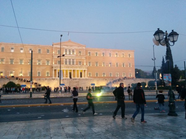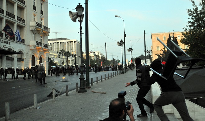 Επίσης, ομάδα κουκουλοφόρων εκτόξευσε βόμβες μολότοφ, πέτρες και φωτοβολίδες κατά ανδρών των ΜΑΤ, που βρίσκονταν μπροστά από την είσοδο του ξενοδοχείου “Μεγάλη Βρετάνια”. Μετά από λίγα λεπτά, οι άνδρες των MAT απάντησαν με δακρυγόνα και χειροβομβίδες κρότου λάμψης απωθώντας τους κουκουλοφόρους και προχώρησαν σε προσαγωγές.