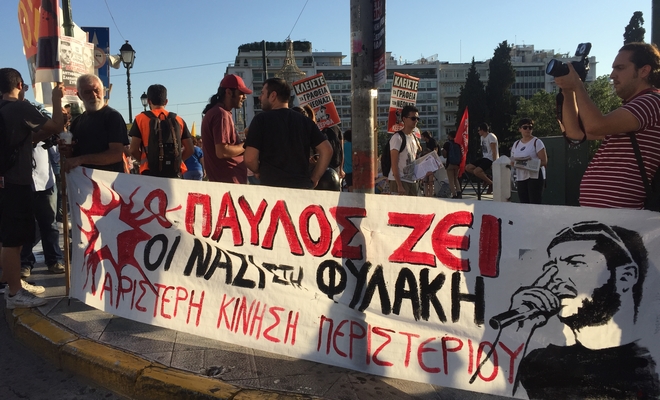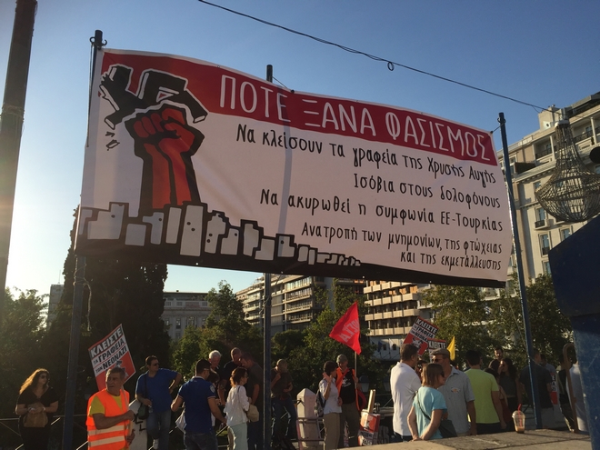 Νωρίτερα το απόγευμα πλήθος κόσμου συγκεντρώθηκε στην Πλατεία Συντάγματος από συλλογικότητες, δημοτικές κινήσεις, την Πρωτοβουλία για το κλείσιμο των γραφείων της Χρυσής Αυγής, το ΚΕΕΡΦΑ, τον Σύλλογο Φυλακισθέντων και Εξορισθέντων Αντιστασιακών (ΣΦΕΑ), την ΑΔΕΔΥ, συνδικάτα, διάφορες οργανώσεις της εξωκοινοβουλευτικής αριστεράς και συλλογικότητες αντιεξουσιαστών, κοινότητες μεταναστών, φοιτητικούς συλλόγους κλπ.