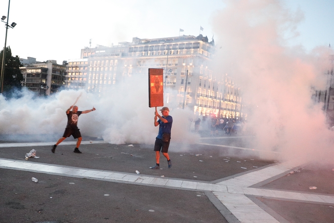 Περίπου ένα τέταρτο μετά τις 8 το βράδυ ομάδα ατόμων, που είχε παρεισφρήσει στους 7.000 – 8.000 διαδηλωτές, πέταξε φωτοβολίδες και διάφορα αντικείμενα προς τις διμοιρίες της Αστυνομίας με αποτέλεσμα να ξεσπάσουν συγκρούσεις με τους αστυνομικούς.