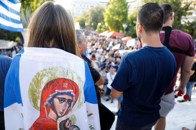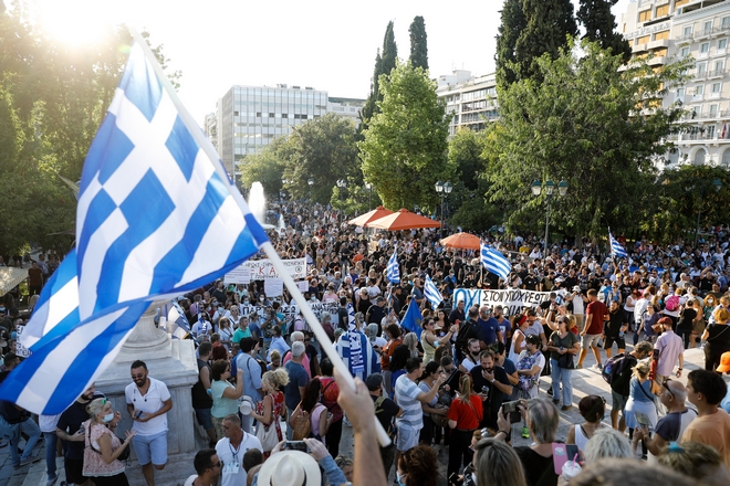 Χωρίς μάσκες και αποστάσεις, 5.000 άνθρωποι, σύμφωνα με στοιχεία από την αστυνομία, συγκεντρώθηκαν στο Σύνταγμα, αντιδρώντας, μεταξύ άλλων, στην απόφαση της Κυβέρνησης να εφαρμόσει τον υποχρεωτικό εμβολιασμό.