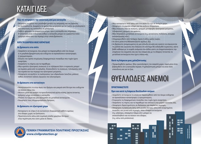 Για περισσότερες πληροφορίες και οδηγίες αυτοπροστασίας από τα έντονα καιρικά φαινόμενα, οι πολίτες μπορούν να επισκεφθούν την ιστοσελίδα της Γενικής Γραμματείας Πολιτικής Προστασίας στην ηλεκτρονική διεύθυνση www.civilprotection.gr.