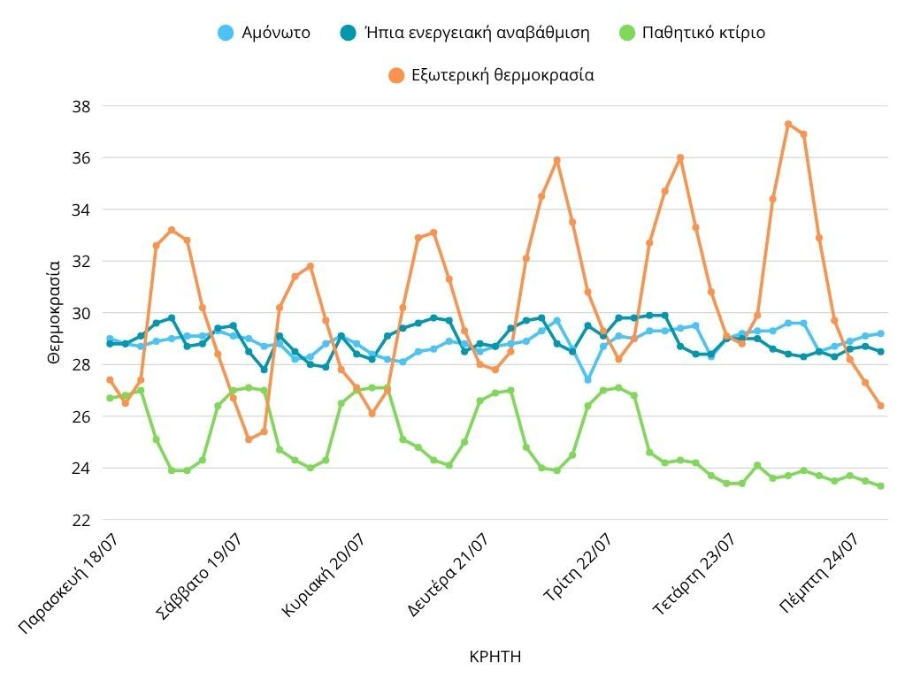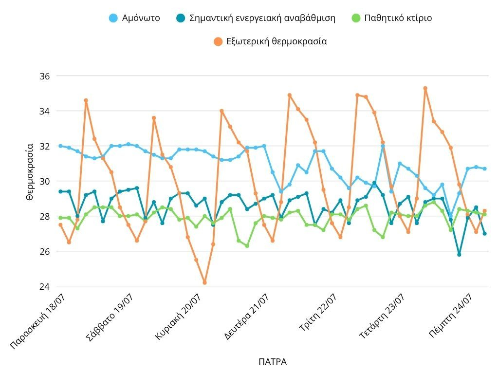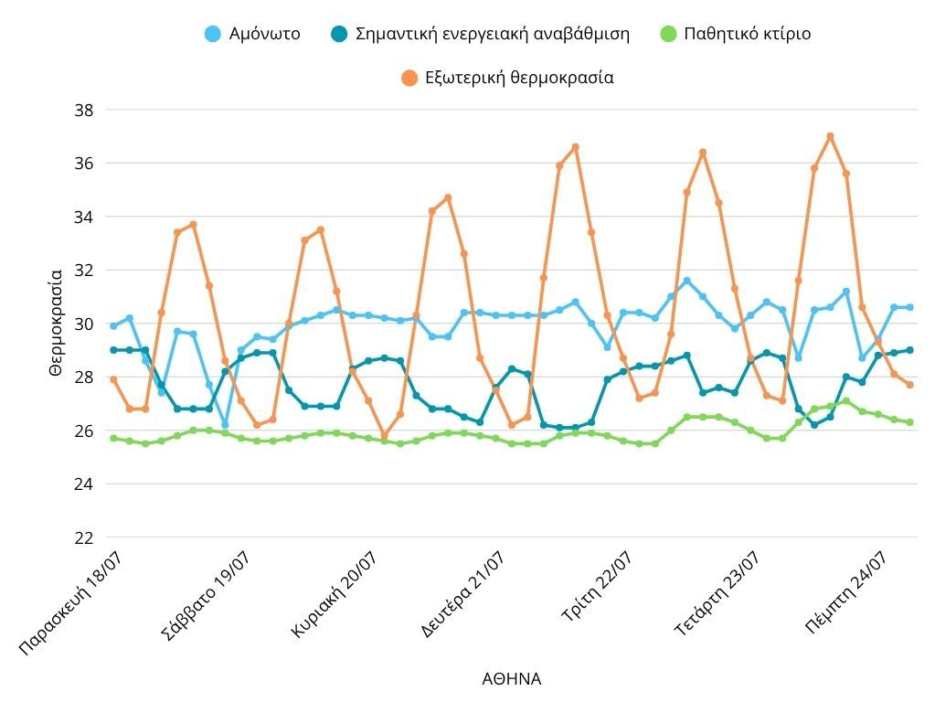• Οι κατοικίες με σημαντική ενεργειακή αναβάθμιση δεν παρουσιάζουν έντονες διακυμάνσεις στην εσωτερική τους θερμοκρασία πριν και κατά τη διάρκεια του καύσωνα, με τις καταγραφές να παραμένουν μεταξύ 27-29°C.