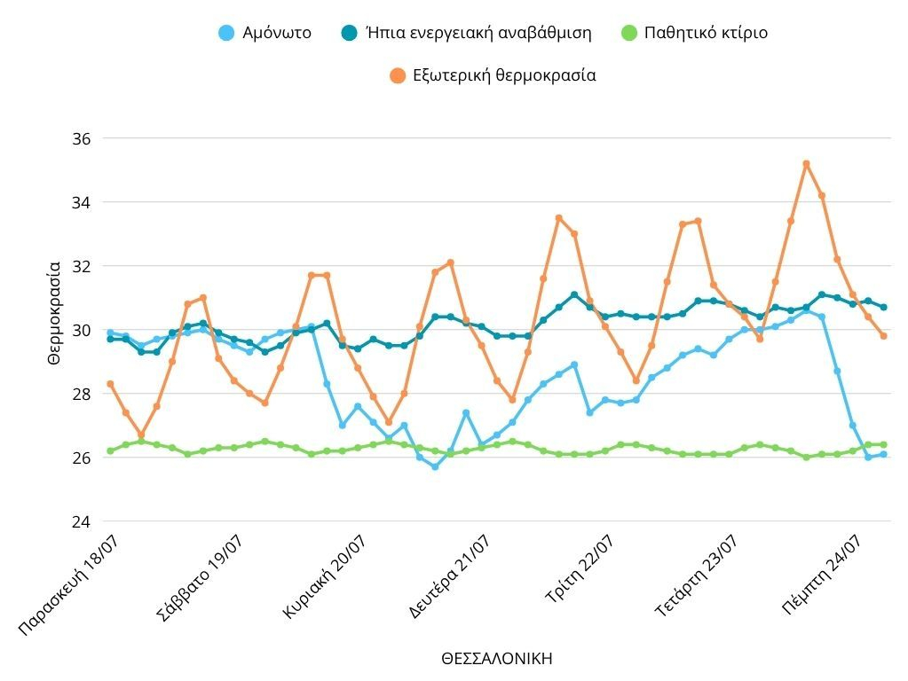 • Οι αμόνωτες κατοικίες είχαν σταθερά υψηλές θερμοκρασίες, μεταξύ 29 και 30°C, ήδη τις ημέρες πριν τον καύσωνα (18-20 Ιουλίου), ενώ τις ημέρες του καύσωνα (21-23 Ιουλίου) οι εσωτερικές θερμοκρασίες ανέβηκαν στους 30-32°C. Σε αυτές τις κατοικίες η θερμοκρασία παρέμενε ψηλά ακόμα και τις πρώτες πρωινές ώρες.