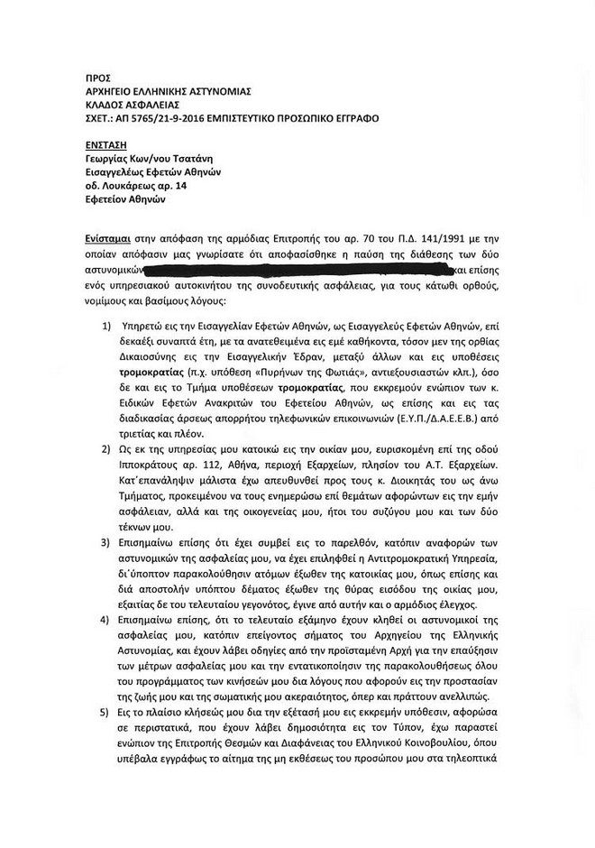 “Το τελευταίο εξάμηνο έχουν κληθεί οι αστυνομικοί της ασφάλειας μου κατόπιν επείγοντος αιτήματος του αρχηγείου της Ελληνικής Αστυνομίας και έχουν λάβει οδηγίες από την προϊσταμένη αρχή για την επαύξηση των μέτρων ασφαλείας μου και την εντατικοποίηση της παρακολουθήσεως όλου του προγράμματος των κινήσεων μου δια λόγους που αφορούν εις την προστασίαν της ζωής μου και της σωματικής μου ακεραιότητας όπως και πράττουν ανελλιπώς”.