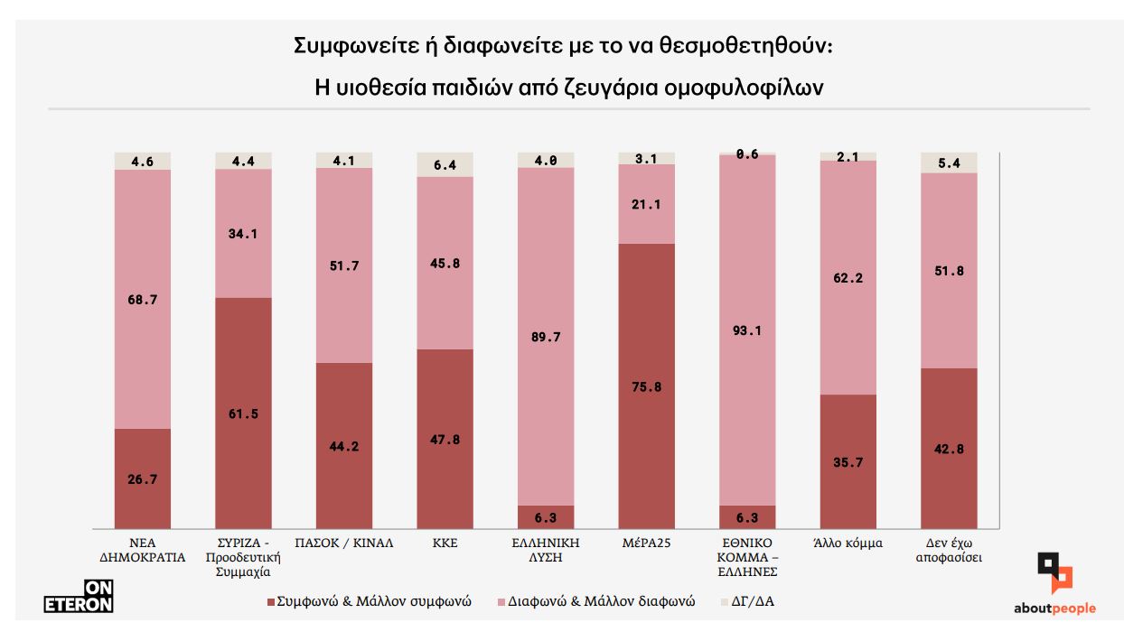 Σε επίπεδο κομμάτων, οι περισσότεροι που τάσσονται υπέρ της υιοθεσίας παιδιών από ομόφυλα ζευγάρια είναι οι ψηφοφόροι του ΜέΡΑ 25 και του ΣΥΡΙΖΑ, ενώ σε ο,τι αφορά το ΠΑΣΟΚ και το ΚΚΕ, οι απόψεις είναι μοιρασμένες. Διαφορετική είναι η εικόνα μεταξύ των ψηφοφόρων της ΝΔ, ενώ συντριπτικά κατά είναι οι ψηφοφόροι της Ελληνικής Λύσης.