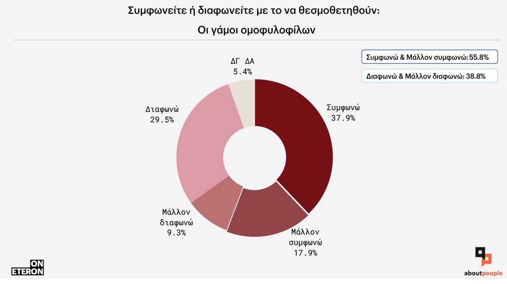 Χαρακτηριστικά, το 55,8% αναφέρει πως Συμφωνεί/Μάλλον συμφωνεί με τους γάμους μεταξύ ομόφυλων ζευγαριών, και το 38,8% Διαφωνεί/Μάλλον διαφωνεί.