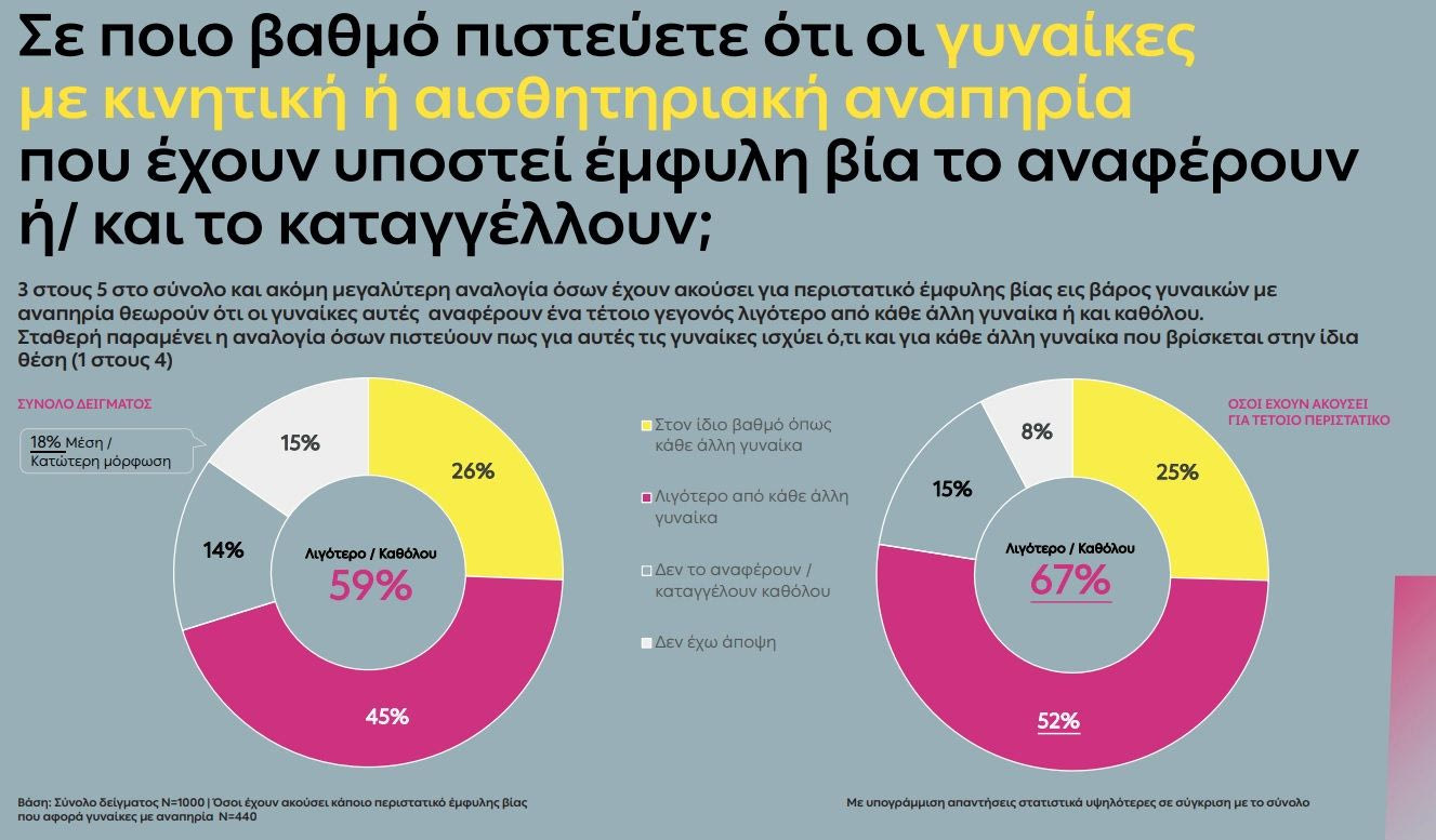 Σύμφωνα με τα ευρήματα της έρευνας, 3 στους 5 στο σύνολο και ακόμη µμεγαλύτερη αναλογία όσων έχουν ακούσει για περιστατικό έµφυλης βίας εις βάρος γυναικών µε αναπηρία θεωρούν ότι οι γυναίκες αυτές αναφέρουν ένα τέτοιο γεγονός λιγότερο από κάθε άλλη γυναίκα ή και καθόλου.