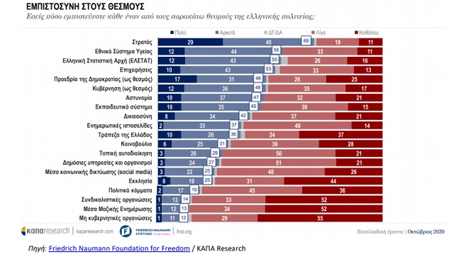 Τις Ένοπλες Δυνάμεις, το Εθνικό Σύστημα Υγείας και την Ελληνική Στατιστική Αρχή (ΕΛΣΤΑΤ) εμπιστεύεται περισσότερο από όλους τους κατεστημένους θεσμούς ο Έλληνας με βάση τα αποτελέσματα της πρόσφατης Έρευνας του Friedrich Naumann Foundation που αναδημοσιεύει η ΕΛΣΤΑΤ.