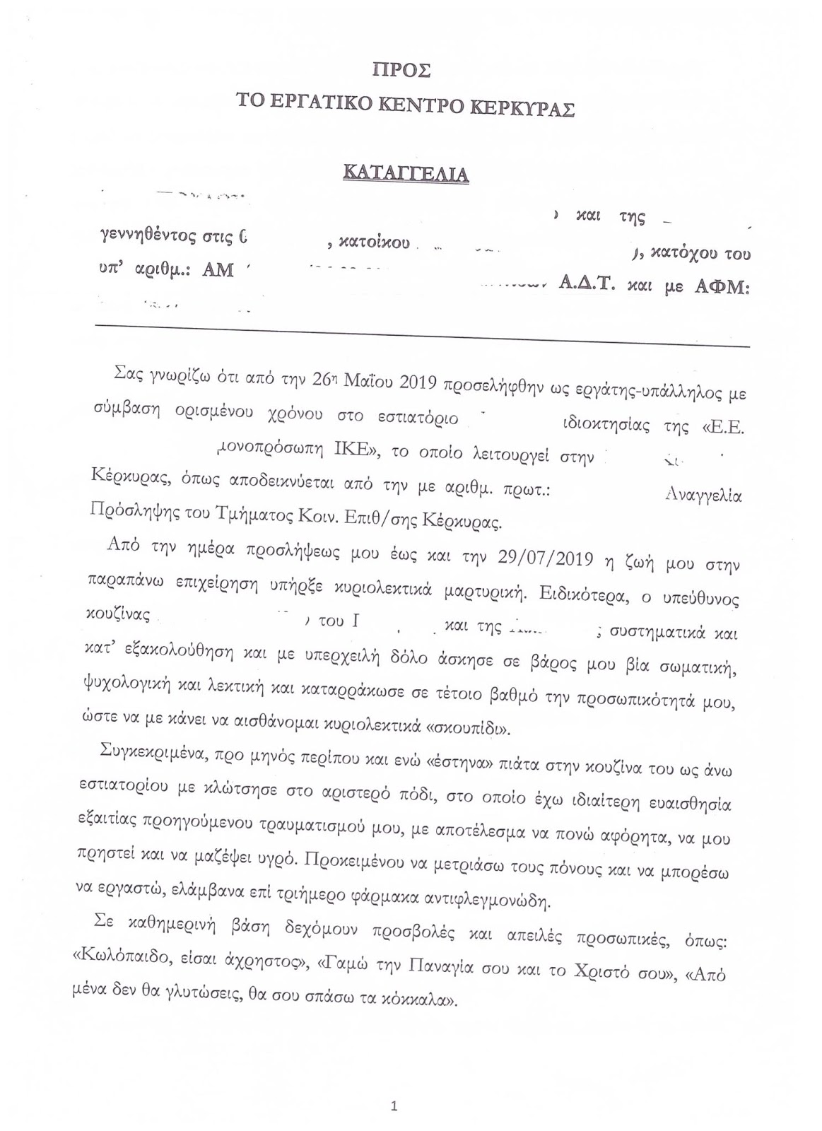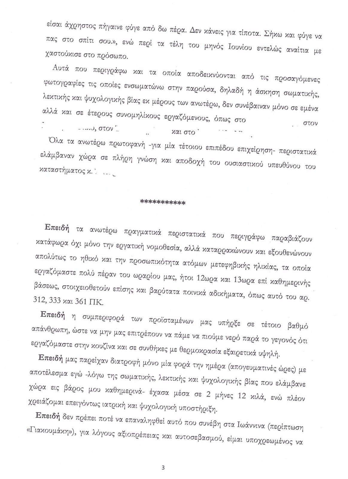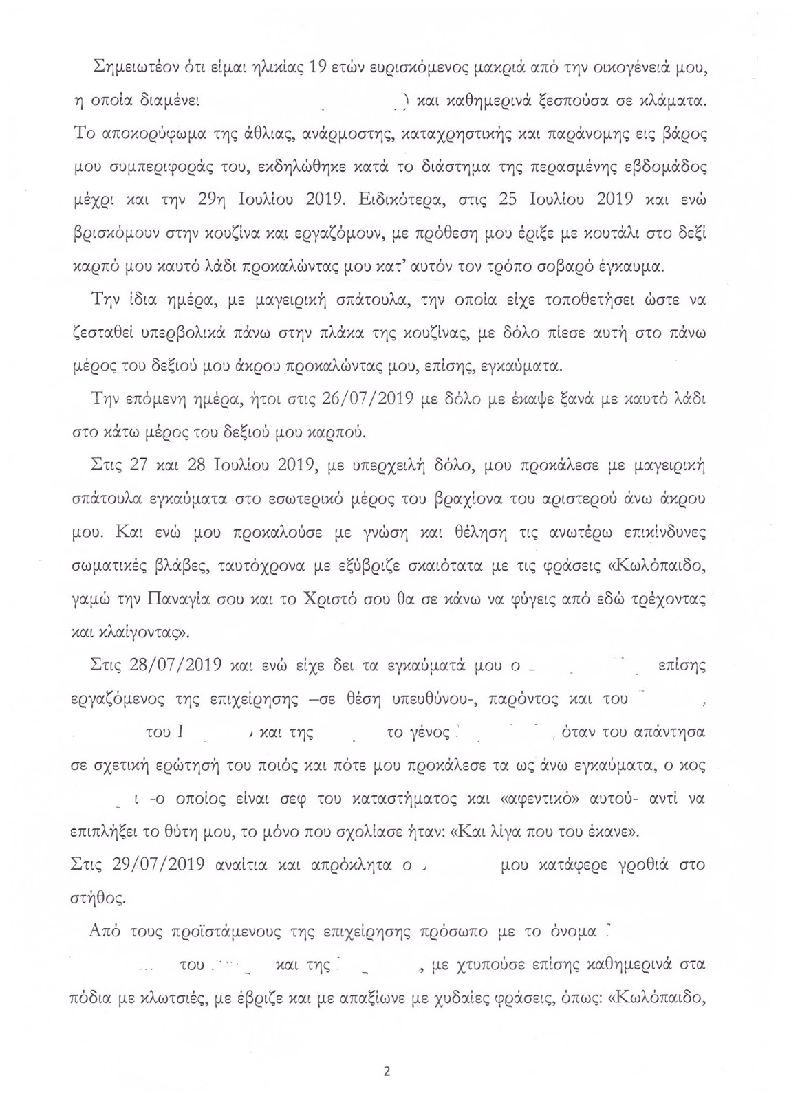“Μου πετούσε καυτό λάδι πάνω στα χέρια , μου προκαλούσε εγκαύματα με καυτή σπάτουλα, με εξύβριζε σκαιότατα ενώ επίσης κατάφερε κλωτσιά στο τραυματισμένο μου πόδι”. Παράλληλα, δήλωσε πως απειλήθηκε ότι αν δημοσιοποιούσε το περιστατικό δεν θα έβρισκε πουθενά αλλού δουλειά.