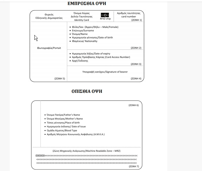 Ζώνη 6: Όνομα Πατέρα, Όνομα Μητέρας, Τόπος Γέννησης, Ημερομηνία Έκδοσης, Ομάδα Αίματος, Αριθμός Μητρώου Κοινωνικής Ασφάλισης (ΑΜΚΑ), ψηφιακό δακτυλικό αποτύπωμα
