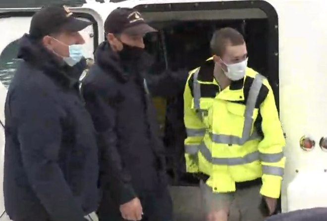 Η κάμερα κατέγραψε τη στιγμή της μεταφοράς του, όπου ο νεαρός κατέβηκε από το ασθενοφόρο του λιμενικού χαμογελαστός κι έδειχνε καλά στην υγεία του, ωστόσο δεν έκανε κάποια δήλωση.