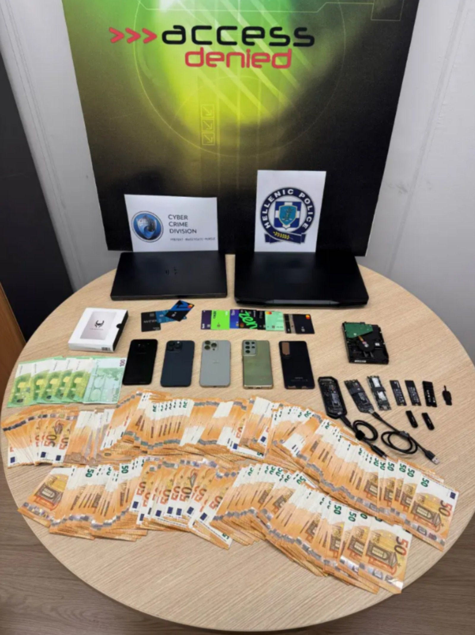 Στην οικία του βρέθηκαν χρεωστικές τραπεζικές κάρτες, -15.205- ευρώ, -8.134,56- ευρώ σε κρυπτονομίσματα, «ψηφιακό πορτοφόλι», -7- σκληροί δίσκοι, κινητά τηλέφωνα, USB κ.α.