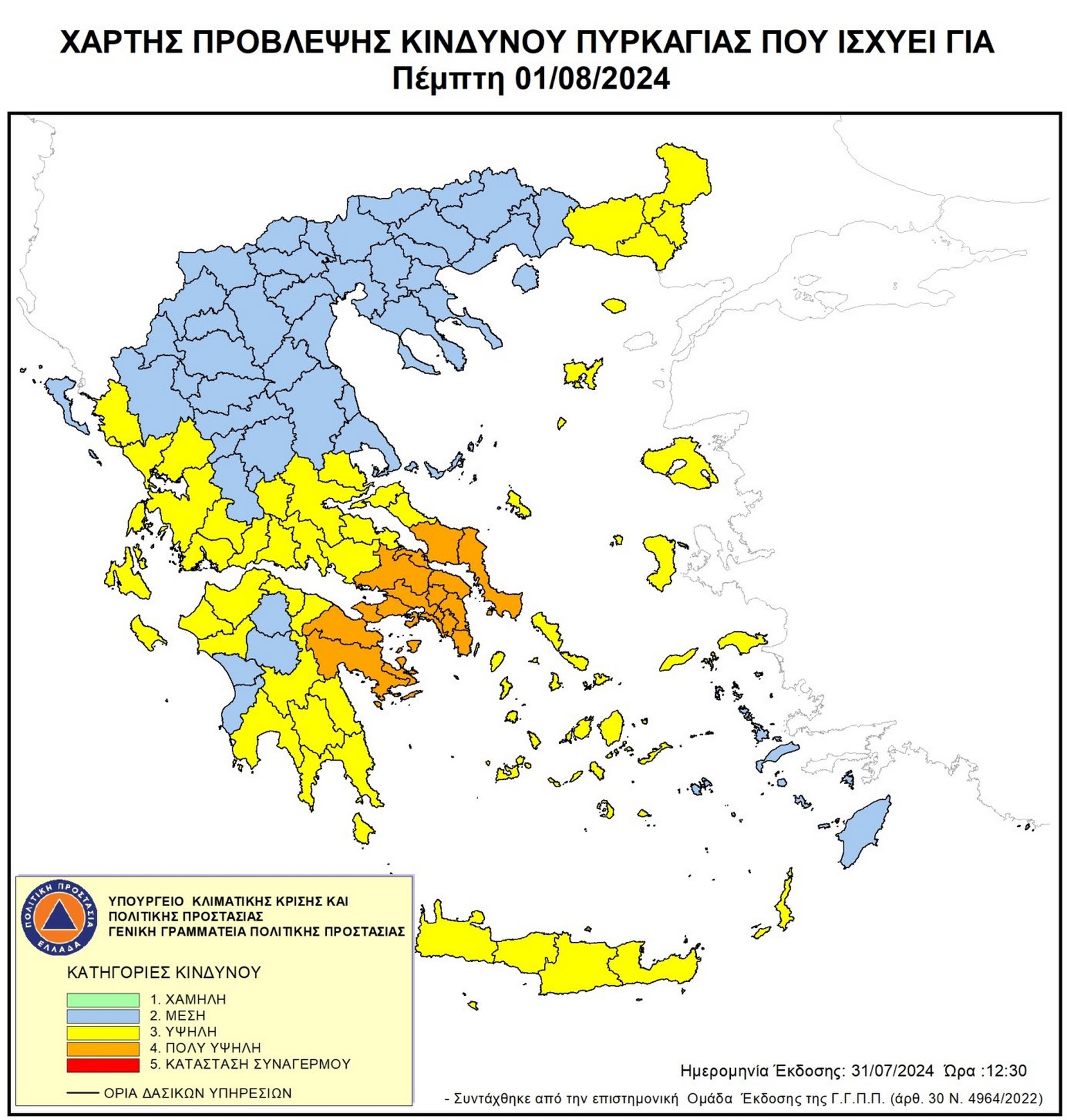 Σημειώνεται ότι πολύ υψηλός κίνδυνος πυρκαγιάς (κατηγορία κινδύνου 4) προβλέπεται σήμερα, Πέμπτη (01/08), στην περιφέρεια Αττικής καθώς και περιοχές της Στερεάς Ελλάδας και της Πελοποννήσου σύμφωνα με το Χάρτη Πρόβλεψης Κινδύνου Πυρκαγιάς που εκδίδει η γενική γραμματεία Πολιτικής Προστασίας του υπουργείου Κλιματικής Κρίσης και Πολιτικής Προστασίας.