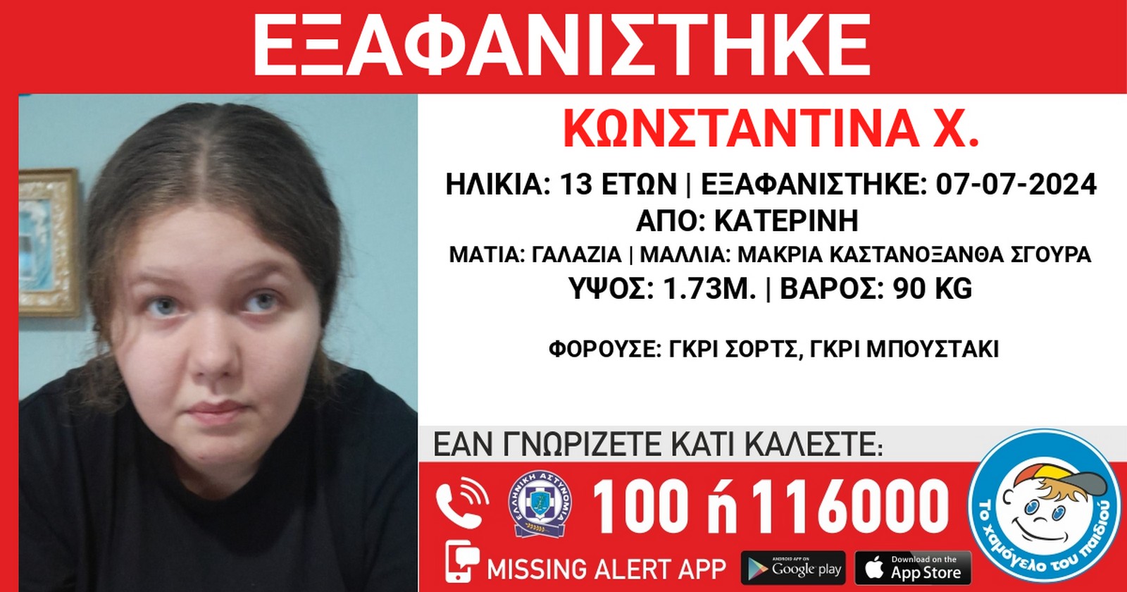 Συναγερμός στην Κατερίνη για την εξαφάνιση 13χρονης. Οποιοσδήποτε έχει κάποια πληροφορία, παρακαλείται να επικοινωνήσει τηλεφωνικά με «Το Χαμόγελο του Παιδιού».