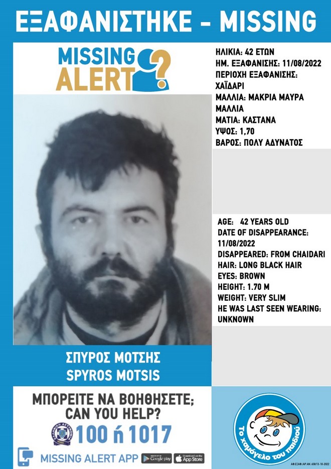 “Στις 11/08/2022 εξαφανίστηκε από την περιοχή του Χαϊδαρίου ο Μότσης Σπύρος, 42 ετών. Το «Χαμόγελο του Παιδιού» ενημερώθηκε για την εξαφάνιση σήμερα 13/10/2022 και προχώρησε στη δημοσιοποίηση των στοιχείων του ενήλικου, κατόπιν αιτήματος της οικογένειάς του, καθώς ενδέχεται να συντρέχουν λόγοι οι οποίοι θέτουν τη ζωή του σε κίνδυνο.
