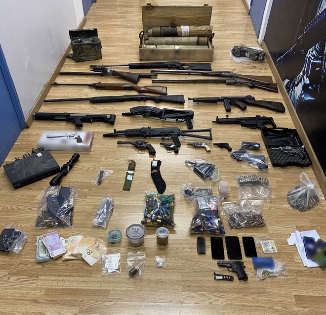 Παράλληλα, πραγματοποιήθηκαν έρευνες σε οικίες και αποθηκευτικούς χώρους σε Ηράκλειο και Αττική, όπου -μεταξύ άλλων- βρέθηκαν και κατασχέθηκαν 5 πολεμικά όπλα, 11 γεμιστήρες και 770 φυσίγγια διαφόρων τύπων και διαμετρημάτων, 3 υποπολυβόλα, 5 πιστόλια, 5 περίστροφα, 3 αεροβόλα όπλα και κυνηγετικό όπλο, 2 θήκες οπλισμού, διόπτρα, 4 μαχαίρια, κυτίο κατάλληλο για αποθήκευση πολεμικού υλικού, 281 γραμμάρια κάνναβη και 1,9 γραμμάρια κάνναβη (σε μορφή σοκολάτας), 21 ναρκωτικά δισκία, 63.290 ευρώ και 10.259 δολάρια, 2 καταγραφικά κλειστού κυκλώματος καμερών, 10 συσκευές κινητών τηλεφώνων, ακουστικό και συσκευή στρατιωτικού ασυρμάτου.