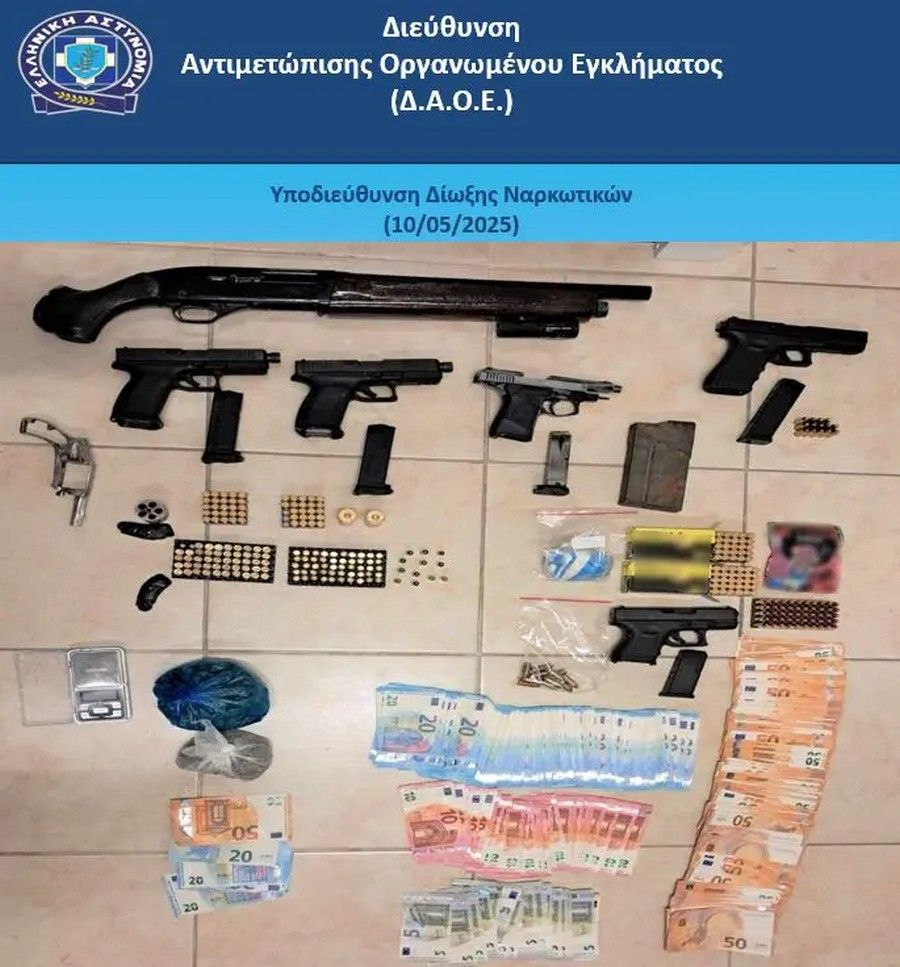 Συνολικά, στο πλαίσιο των ερευνών, βρέθηκαν και κατασχέθηκαν 102,5 γραμμάρια κοκαΐνης, 128,3 γραμμάρια ακατέργαστης κάνναβης, 5 πιστόλια, καραμπίνα με κομμένη κάννη, 5 γεμιστήρες πιστολιών, ένας γεμιστήρας πολεμικού τυφεκίου, σκελετός περιστρόφου, 336 φυσίγγια, ηλεκτρονική ζυγαριά ακριβείας, 2 Ι.Χ. αυτοκίνητα, 4 κινητά τηλέφωνα και 8.385 ευρώ.