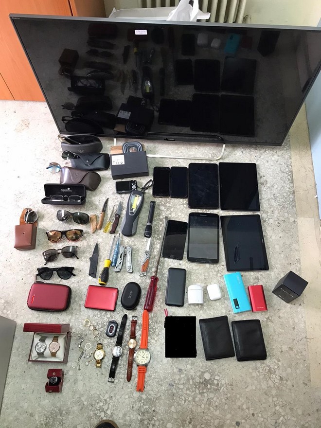 Σε διενεργηθείσες έρευνες σε οικίες και αποθηκευτικούς χώρους-καβάτζες στο κέντρο των Αθηνών, βρέθηκαν και κατασχέθηκαν, μεταξύ άλλων, πλήθος κινητών τηλεφώνων, γυαλιά ηλίου, ηλεκτρονικές συσκευές (Laptop-Tablet κλπ.), πλήθος διαρρηκτικών εργαλείων, μικροποσότητα κάνναβης, δύο ηλεκτρονικές ζυγαριές ακριβείας, πλήθος συσκευασιών επιμερισμού ναρκωτικών ουσιών, δύο Ι.Χ. αυτοκίνητα, μοτοσικλέτα