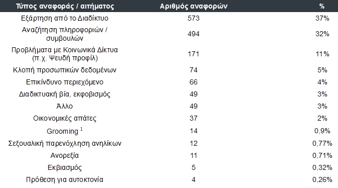 Αναφορικά με τον τύπο του αιτήματος, η πλειοψηφία των αιτημάτων αφορούσε σε θέματα εξάρτησης (37%), ενώ στη δεύτερη θέση βρίσκονται τα αιτήματα αφορούσαν σε γενικές πληροφορίες για την ασφάλεια στο διαδίκτυο (32%). Στην τρίτη θέση, με ποσοστό 11%, αναδείχθηκε μια νέα κατηγορία που αφορά στα προβλήματα με τις σελίδες κοινωνικής δικτύωσης και ιδιαίτερα μέσω της διάσημης ιστοσελίδας “Facebook” (π.χ. ψευδή προφίλ). Αναλυτικά, το περιεχόμενο των αιτημάτων που υποβλήθηκαν στη Γραμμή έχει ως εξής: