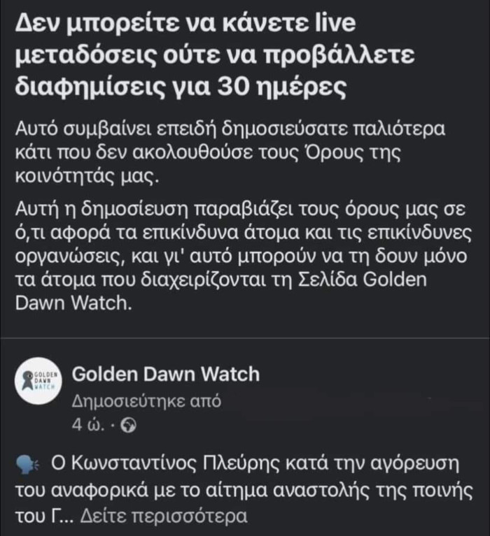 Συγκεκριμένα, όπως φαίνεται στο παρακάτω στιγμιότυπο, το Facebook απέκλεισε το Παρατηρητήριο επειδή κατά τη σημερινή καταγραφή της συνεδρίασης μετέδωσε τη φράση «είμαι ναζί και φασίστας» που ανέφερε προκλητικά στην αίθουσα ο Κωνσταντίνος Πλεύρης, συνήγορος υπεράσπισης του Γιάννη Λαγού.