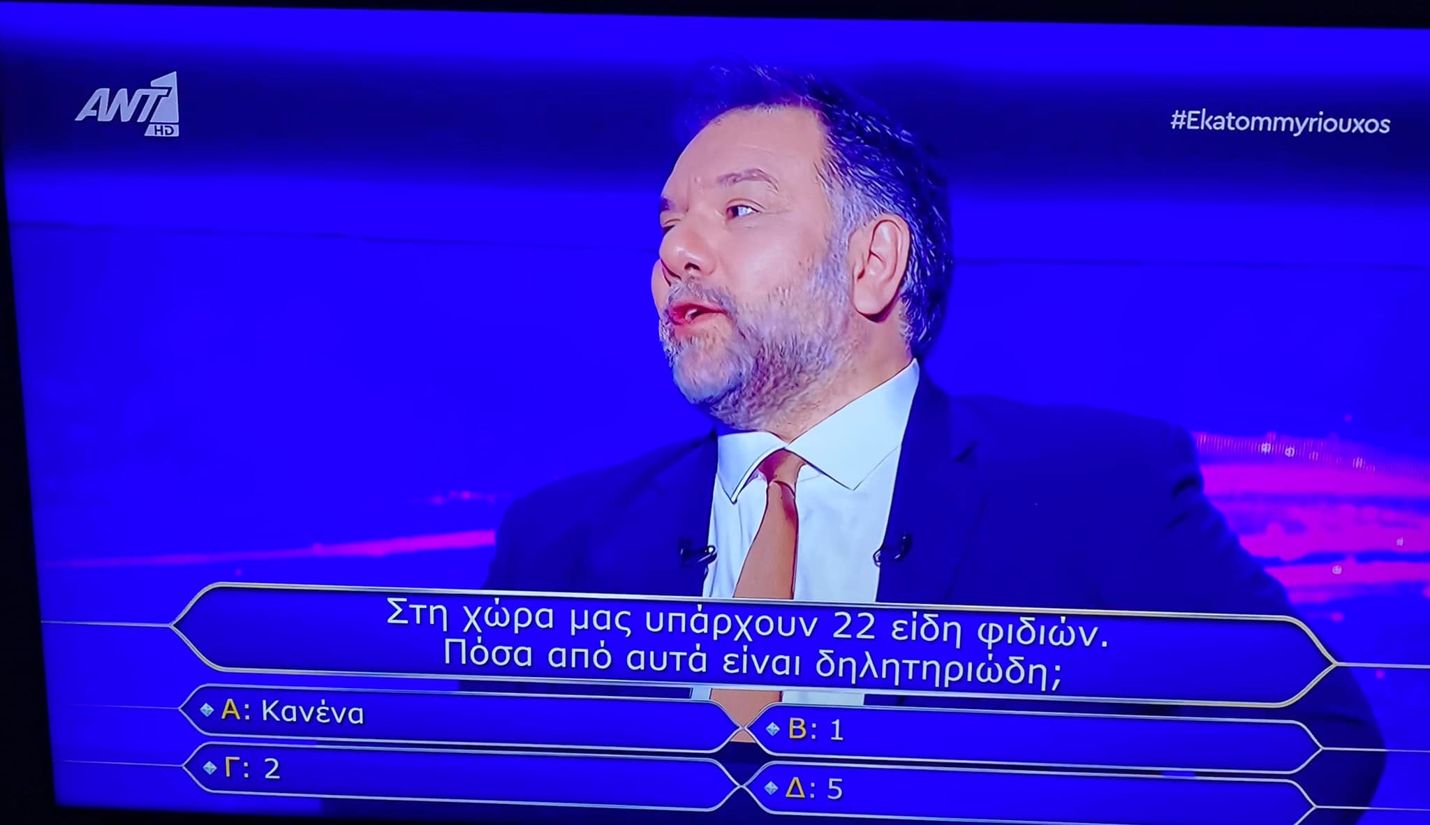 Συγκεκριμένα, ερώτηση που ετέθη σε διαγωνιζόμενο, είχε να κάνει με το πόσα δηλητηριώδη φίδια υπάρχουν στη χώρα μας. Ως σωστή δόθηκε η απάντηση “1”, ενώ ο παίκτης επέλεξε να σταματήσει και να μην απαντήσει.