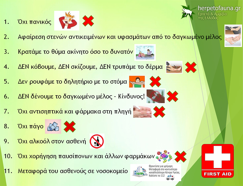 - Όχι ίσχαιμος περίδεση. Η σύσταση να δένουμε σφιχτά με έναν επίδεσμο ή ύφασμα το μέλος πιο ψηλά από το σημείο της πληγής, για να εμποδίσουμε τη διάχυση του δηλητηρίου, είναι λανθασμένη.