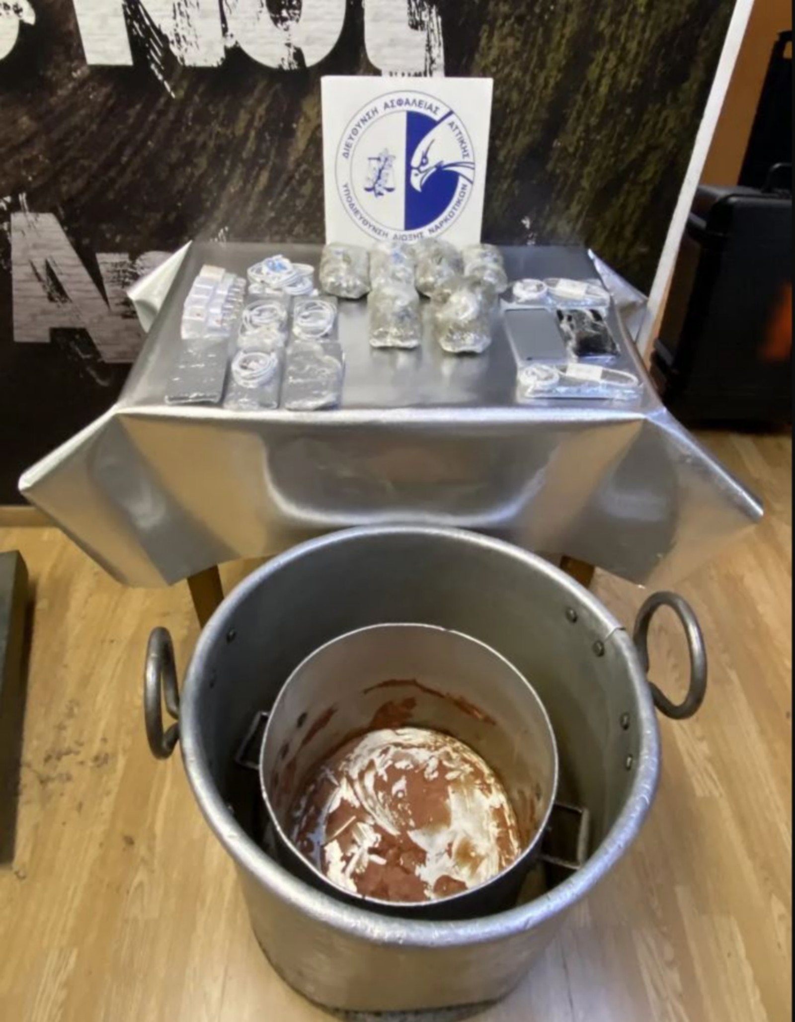 Κατά την επιχείρηση βρέθηκαν σε διπλό πάτο μαγειρικής κατσαρόλας, η οποία βρισκόταν εντός του χώρου φόρτωσης υπηρεσιακού φορτηγού και στη συνέχεια κατασχέθηκαν 6 αυτοσχέδιες νάιλον συσκευασίες, που περιείχαν ακατέργαστη κάνναβη καθαρού συνολικού βάρους 557 γραμμαρίων, 9 συσκευές κινητής τηλεφωνίας, 10 αντάπτορες φόρτισης και 17 καλώδια φόρτισης κινητών τηλεφώνων.