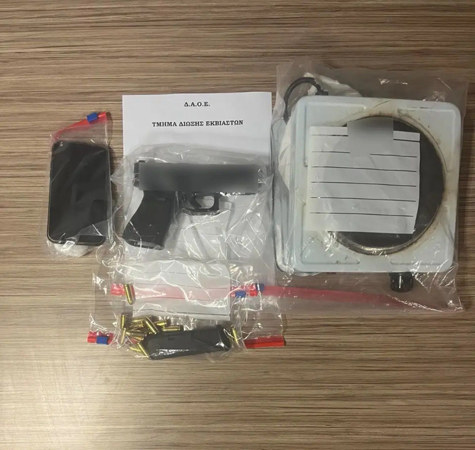 Με τη συνδρομή των επιχειρησιακών ομάδων της Διεύθυνσης Αντιμετώπισης Οργανωμένου Εγκλήματος, αστυνομικοί του Τμήματος Δίωξης Εκβιαστών προχώρησαν σε έρευνα σε κοινόχρηστο χώρο κελιού, όπου στο εσωτερικό ηλεκτρικής συσκευής, βρέθηκαν και κατασχέθηκαν πιστόλι, γεμιστήρας με 15 φυσίγγια, αυτοσχέδια χάρτινη συσκευασία, που περιείχε ποσότητα ηρεμιστικού φαρμάκου, συνολικού μικτού βάρους 0,8 γραμμαρίων, εντός πακέτου τσιγάρων, κινητό τηλέφωνο με κάρτα SIM, φορτιστής κινητού τηλεφώνου και ζευγάρι ασύρματα ακουστικά.