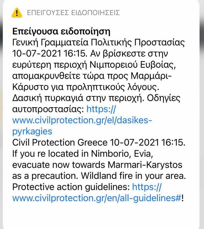 Αναλυτικά αναφέρονται τα εξής: “Αν βρίσκεστε στην ευρύτερη περιοχή Νημποριού Εύβοιας απομακρυνθείτε τώρα προς Μαρμάρι – Κάρυστο για προληπτικούς λόγους. Δασική πυρκαγιά στην περιοχή”.