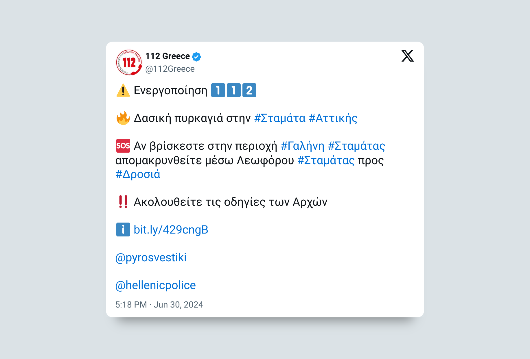 Με διαδοχικά του μηνύματα το 112, ζήτησε την εκκένωση των περιοχών Αμυγδαλέζα, Γαλήνη και Ροδόπολη. Συγκεκριμένα, το 112 ζητά από τους πολίτες που βρίσκονται στην περιοχή Αμυγδαλέζα Σταμάτας να απομακρυνθούν μέσω Λεωφόρου Σταμάτας προς Πλατεία Σταμάτας, από την περιοχή Γαλήνη Σταμάτας να απομακρυνθούν μέσω Λεωφόρου Σταμάτας προς Δροσιά, από την περιοχή Ροδόπολη Αττικής να απομακρυνθούν μέσω Λεωφόρου Σταμάτας προς Δροσιά.