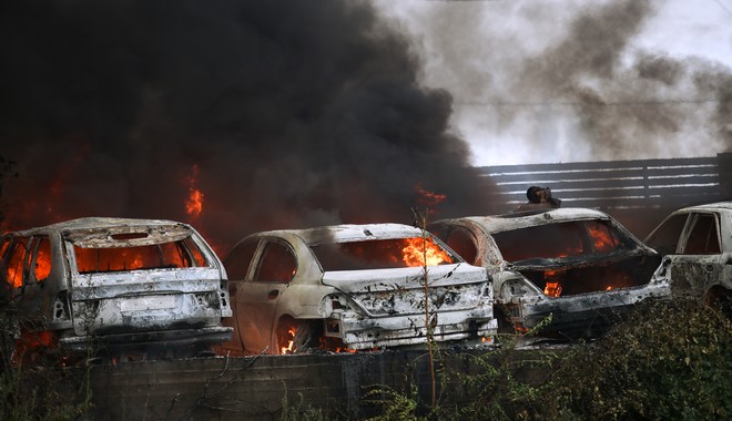 Διαδοχικές εκρήξεις σε μάντρα αυτοκινήτων στις Αφίδνες. Εκατοντάδες αυτοκίνητα παραδόθηκαν στις φλόγες.