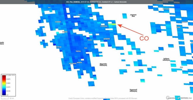 Στην πρώτη φωτογραφία αποτυπώνεται το μονοξείδιο του άνθρακα (CO) λίγο πάνω δεξιά από τη Χαλκίδα με λαχανί χρώμα.